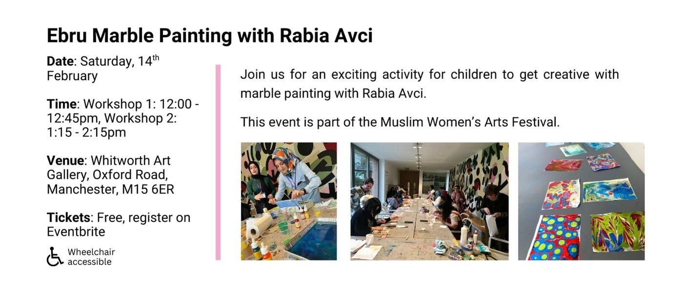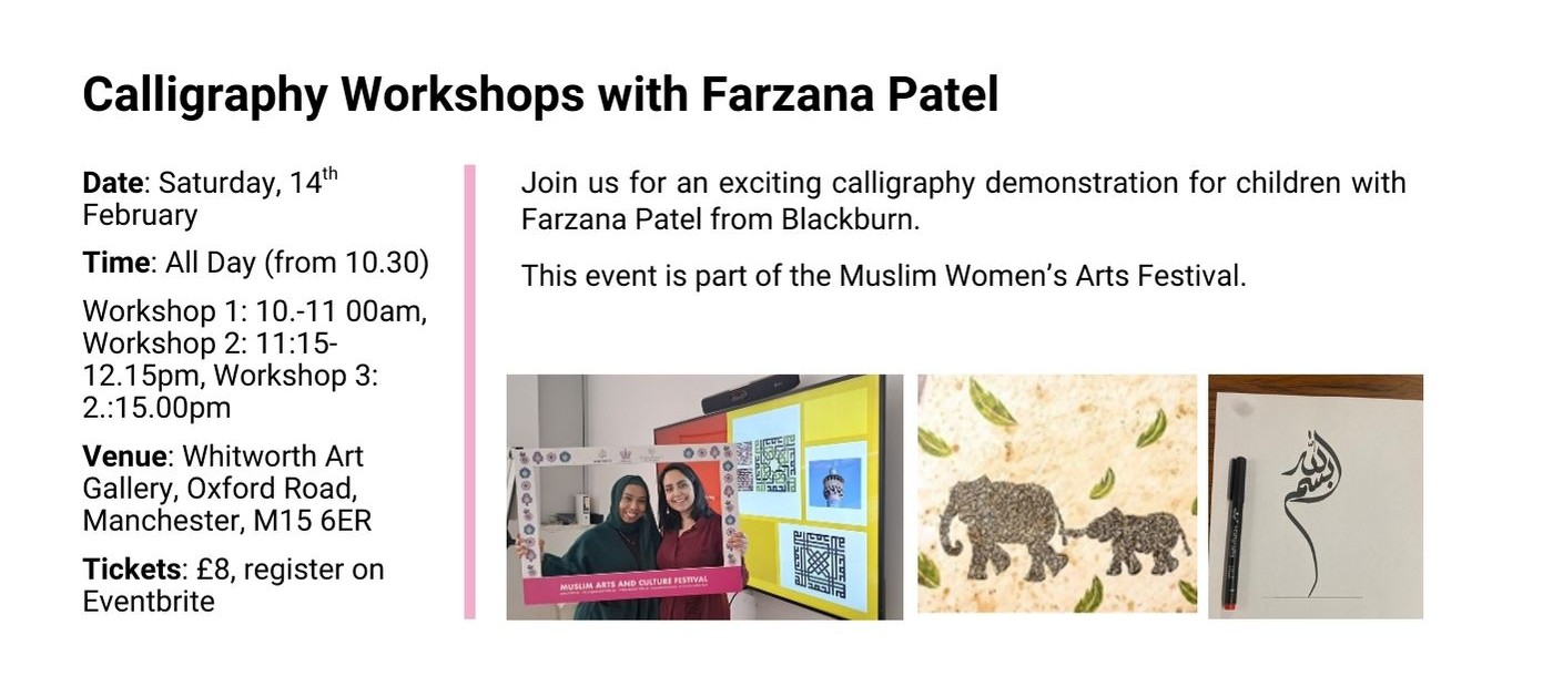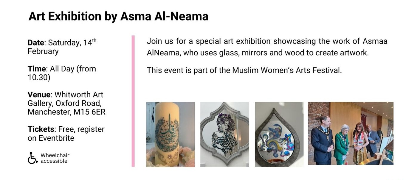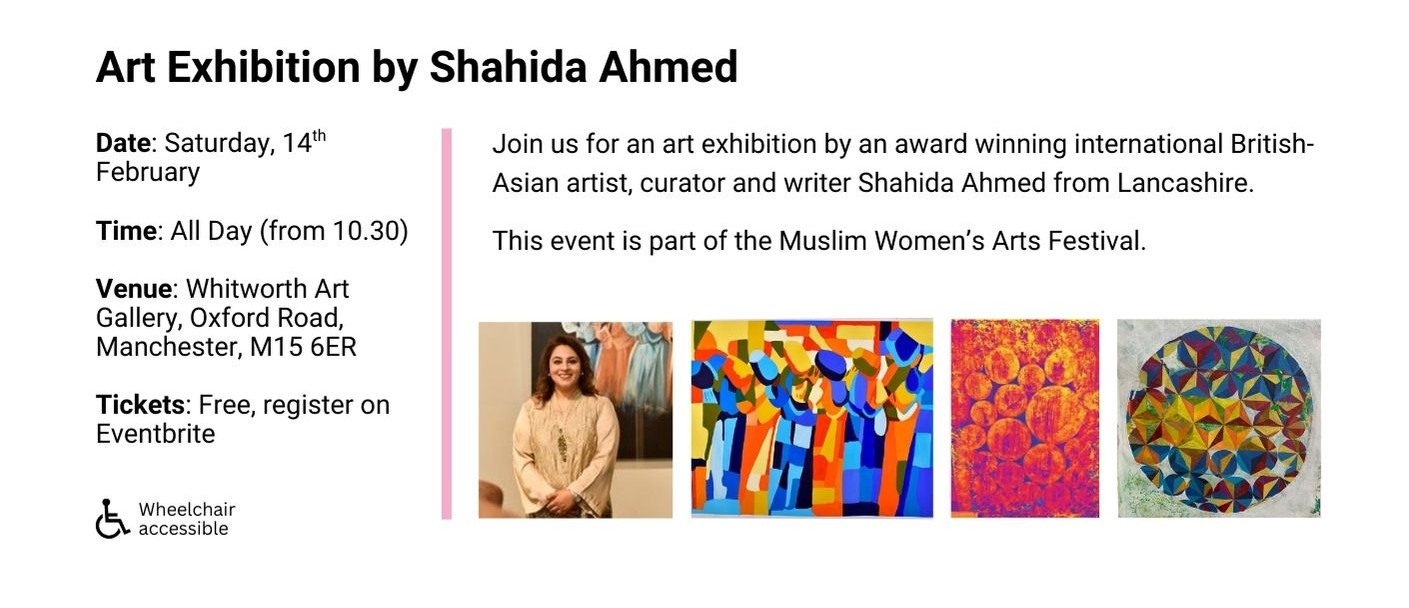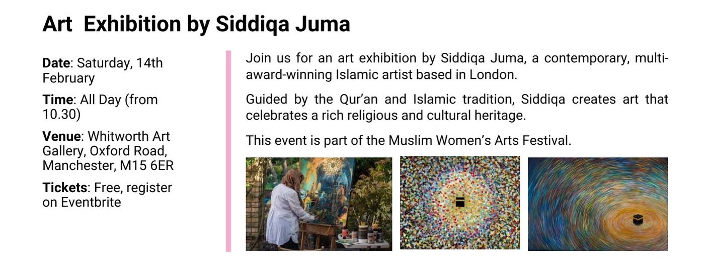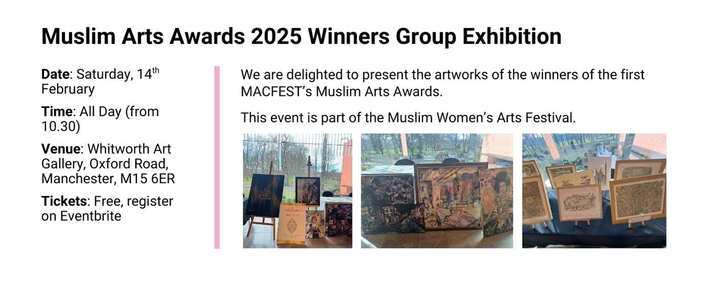 From February till July 2026 we will have our Muslim Women’s Arts Festival showcasing Muslim women speakers, artists and artisans from North West UK and from around the world: our international festivals’ line up will take you on an unmissable arts and culture journey from Manchester to the USA!