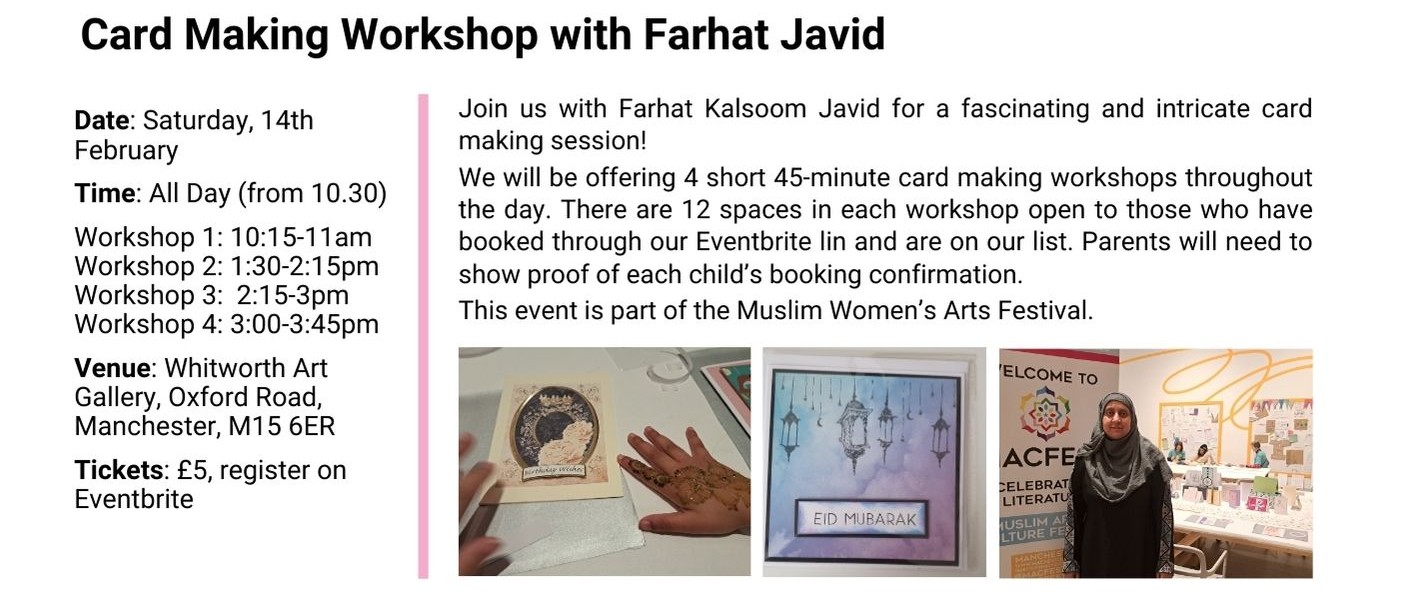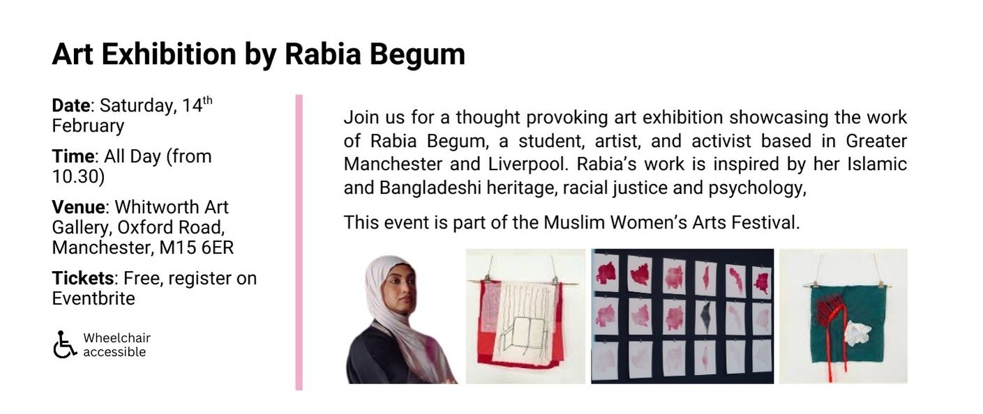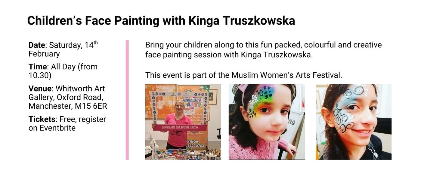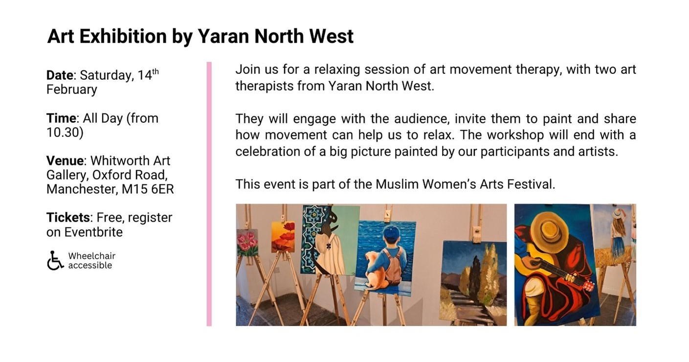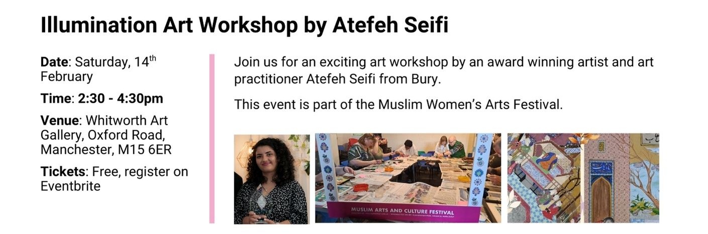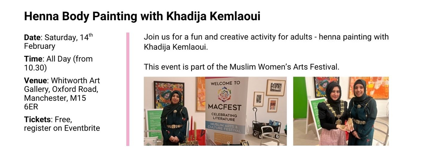 From February till July 2026 we will have our Muslim Women’s Arts Festival showcasing Muslim women speakers, artists and artisans from North West UK and from around the world: our international festivals’ line up will take you on an unmissable arts and culture journey from Manchester to the USA!